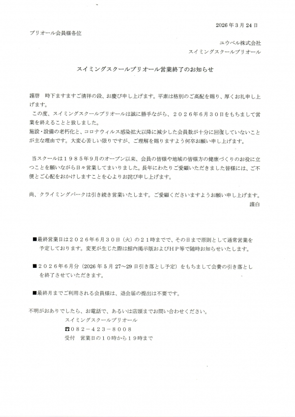 この度、スイミングスクールプリオールは誠に勝手ながら、2026年6月30日をもちまして営業を終えることといたしました。
